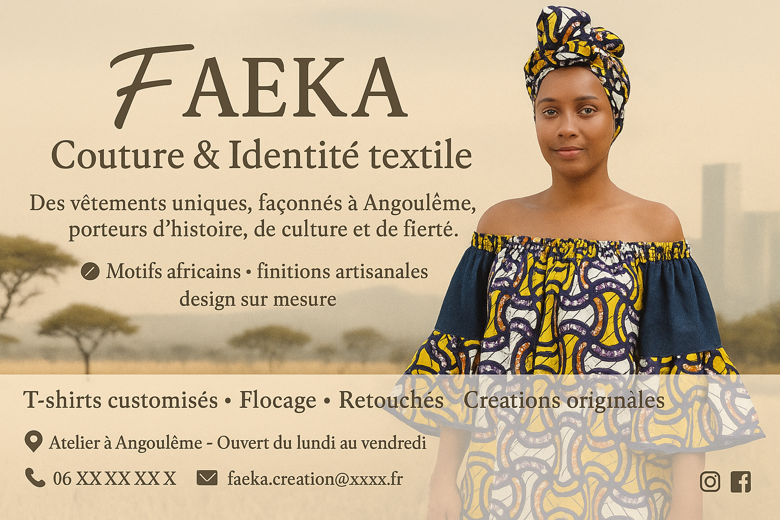 FAEKA signifie plus qu'un simple vêtement. C'est un pont entre les cultures, une trace textile vivante entre le Cameroun et la Charente. Christine développe un style bien à elle :